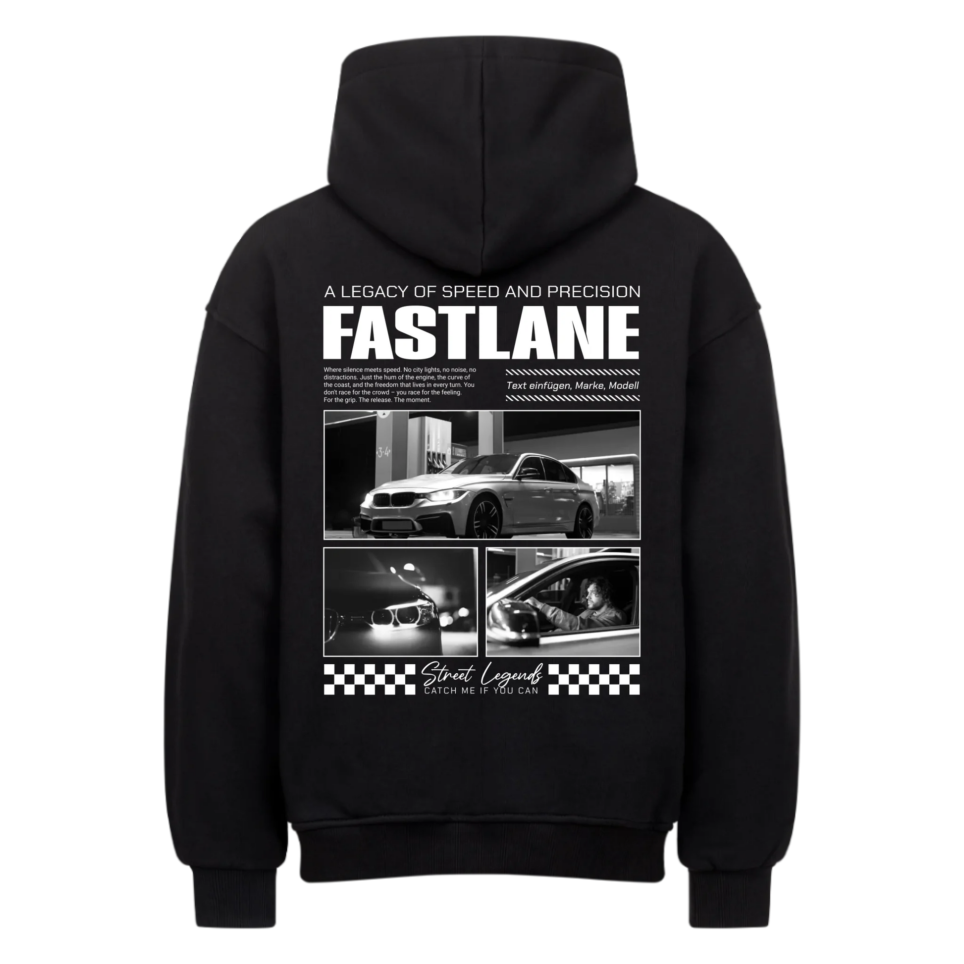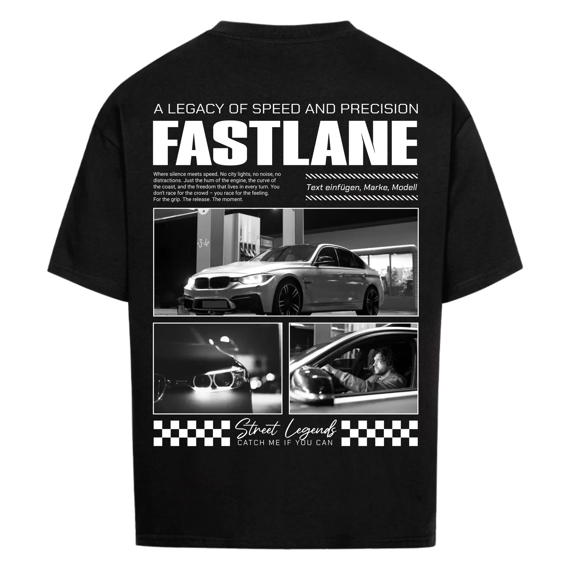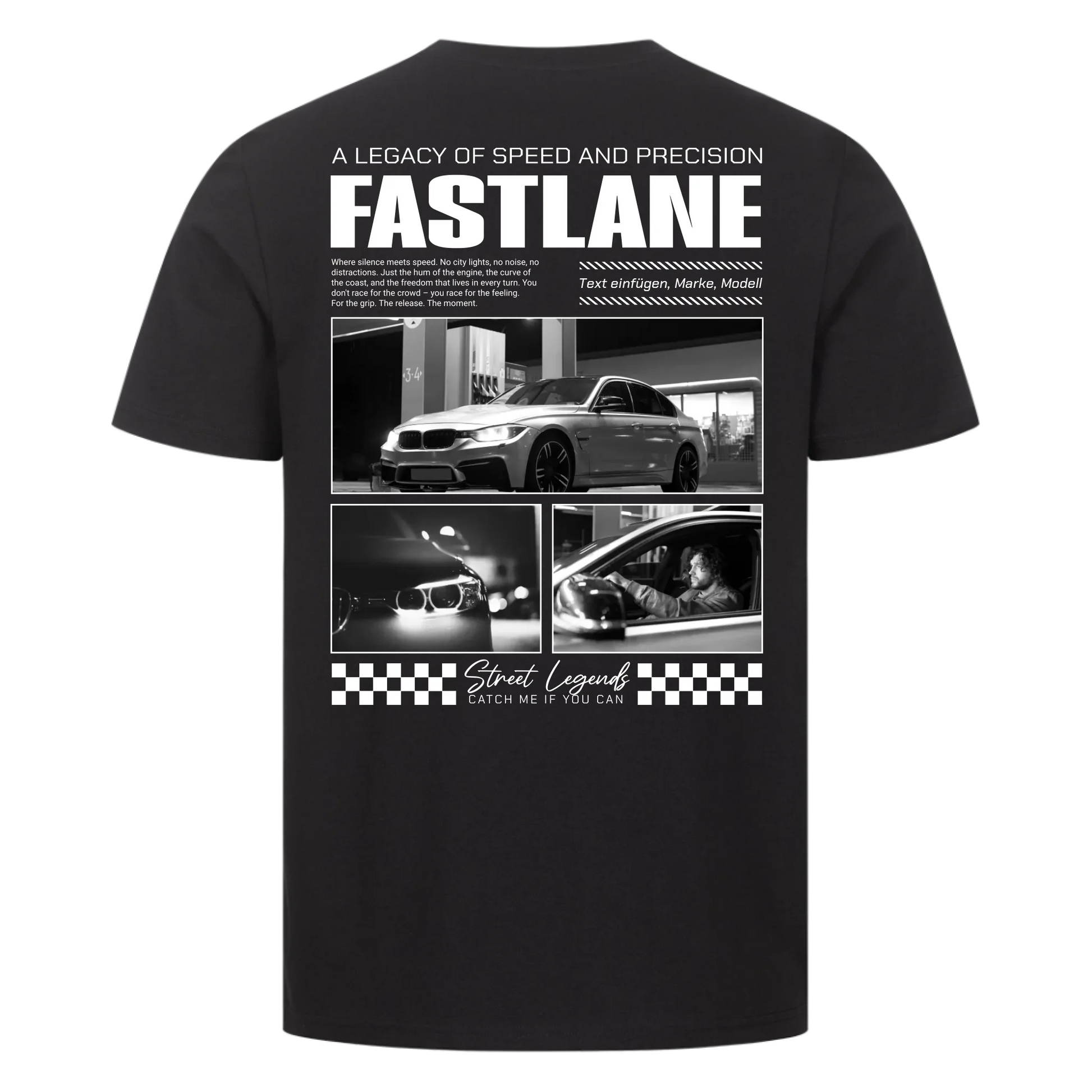 Das FASTLANE T-Shirt ist ein Statement für alle, die Leidenschaft für Tuning, Performance & Design leben. Mit 3 Fotos deines Autos und deinem individuellen Text (z. B. Marke, Modell oder Spitzname) wird dieses Shirt zu deiner persönlichen Hommage an dein Fahrzeug.