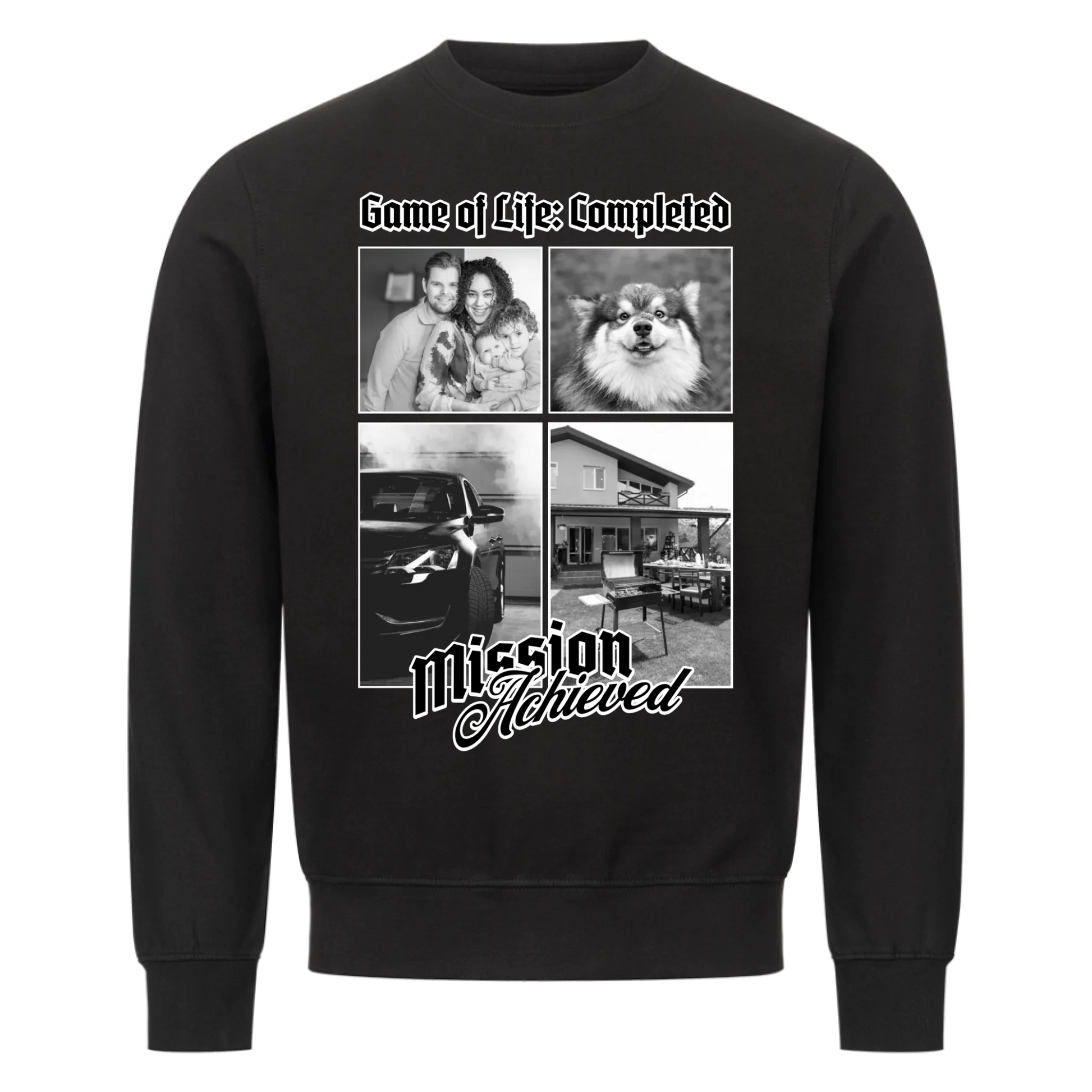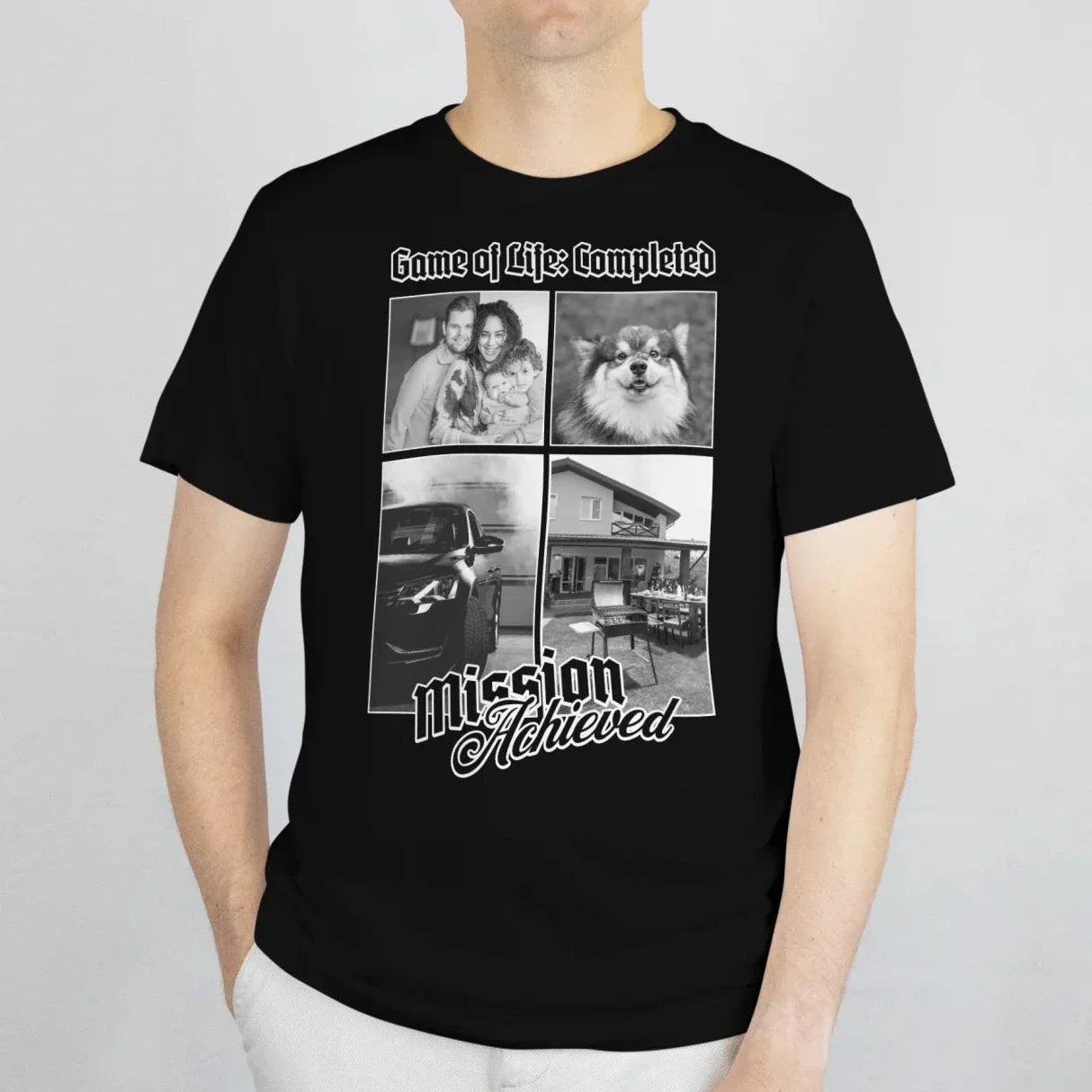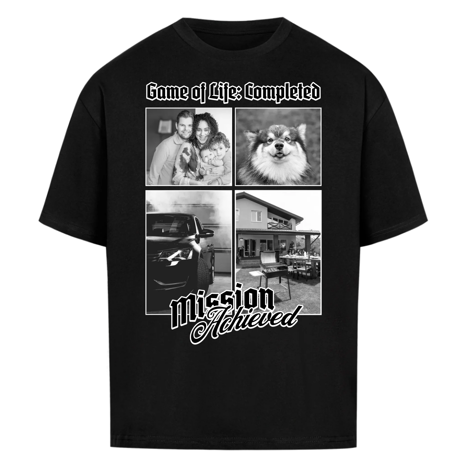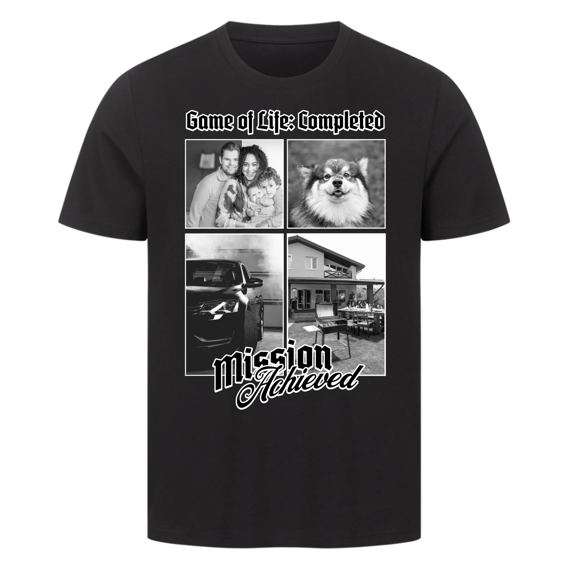 Das Leben durchgespielt – auf deine Art. Dieses Shirt ist der ironische Beweis, dass du deine Mission(en) erfolgreich abgeschlossen hast: Haus, Auto, Familie, Haustier oder einfach dein persönliches Glück.