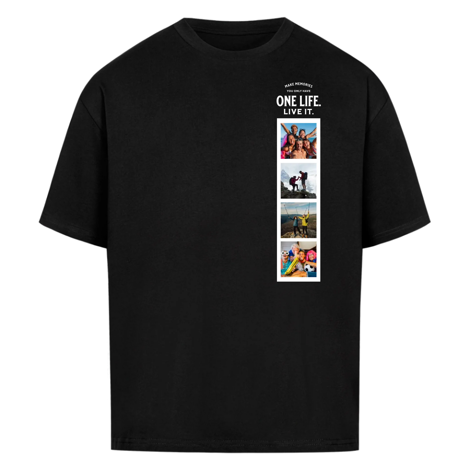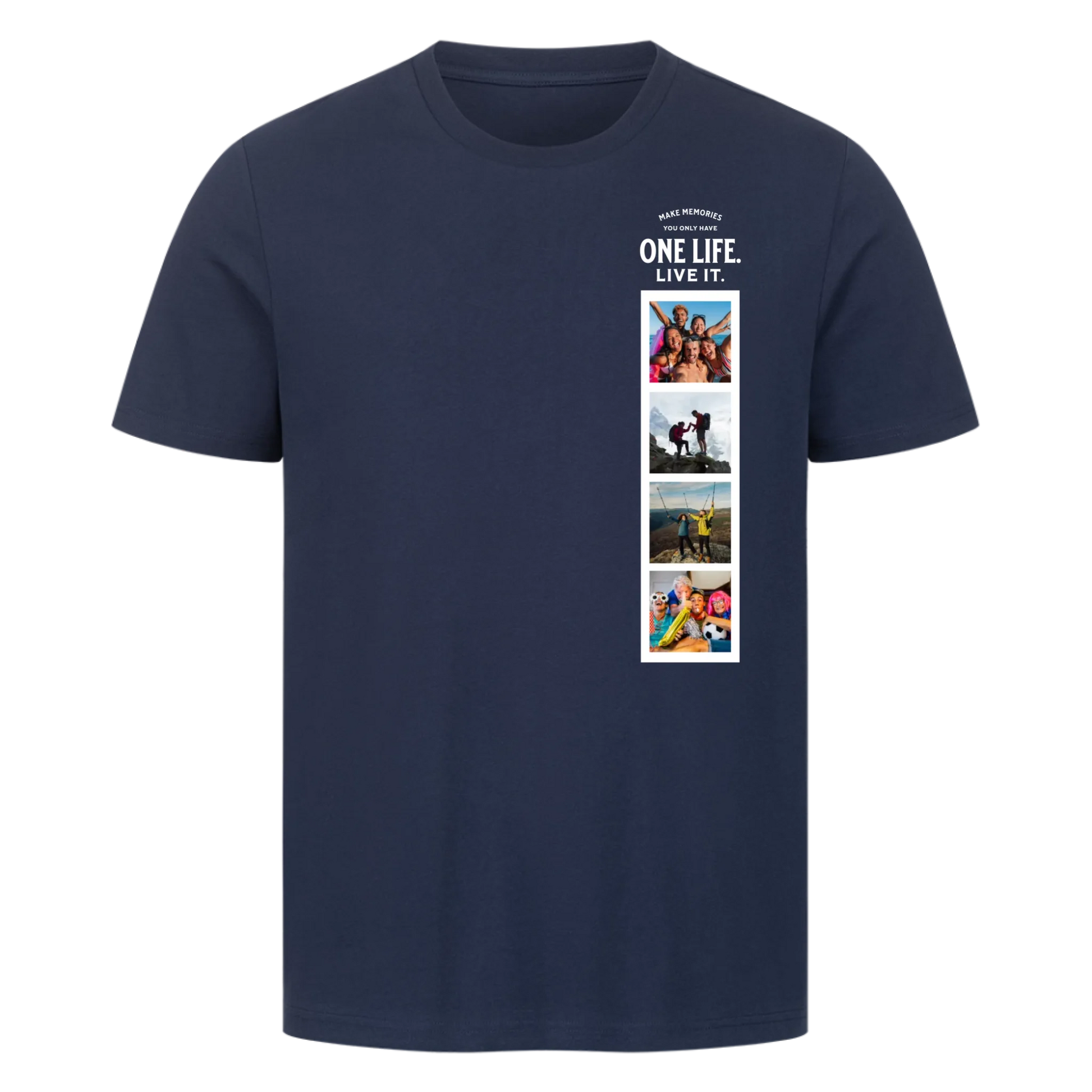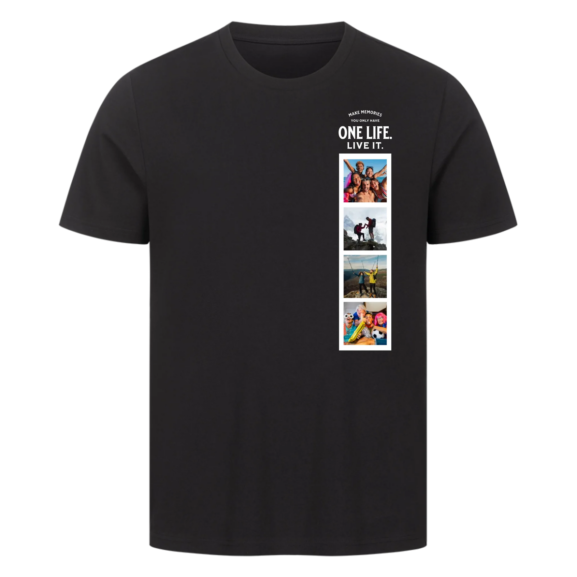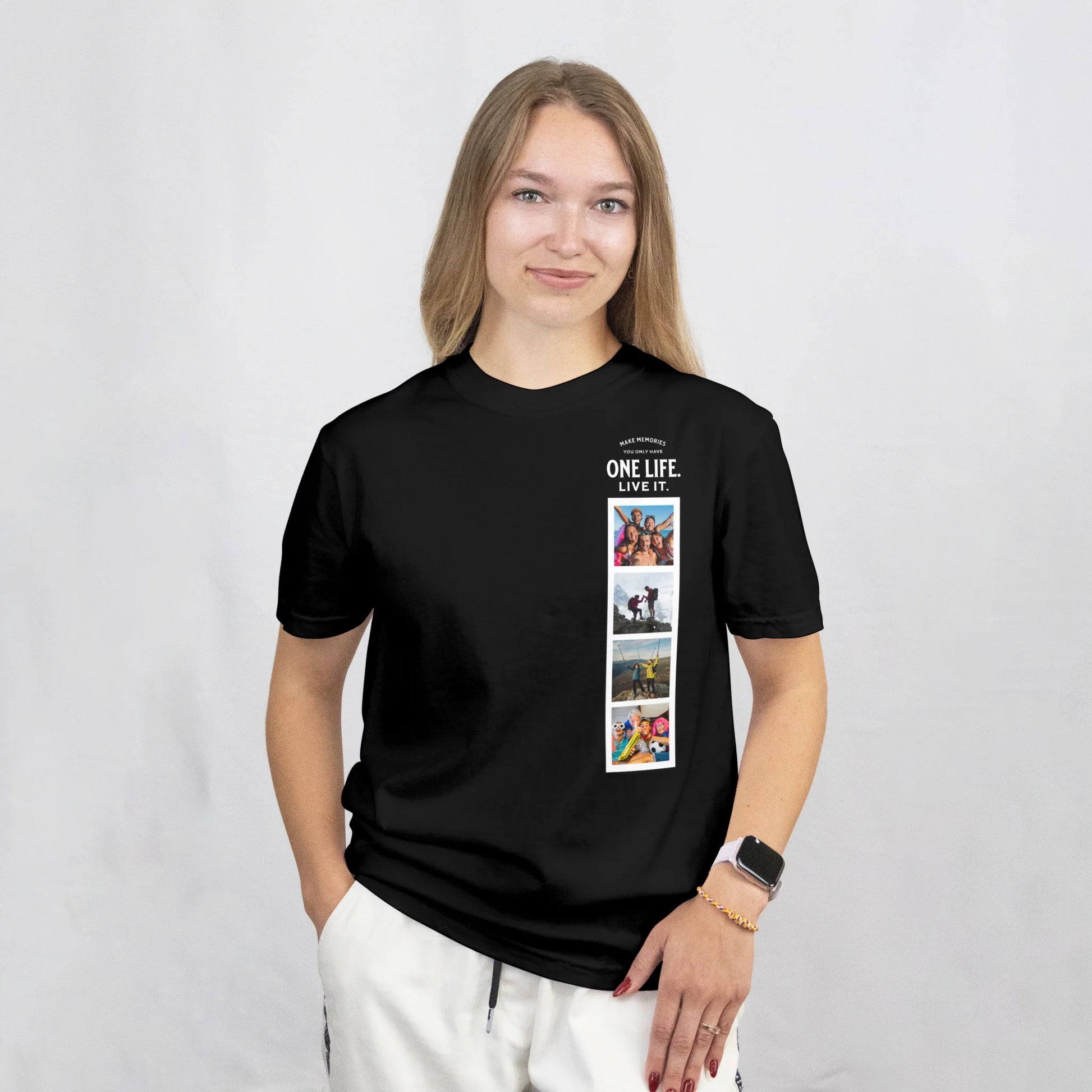 Mit dem personalisierbaren „One Life. Live It.“-T-Shirt trägst du deine schönsten Erinnerungen direkt auf der Brust – im cleanen Filmstreifen-Design.