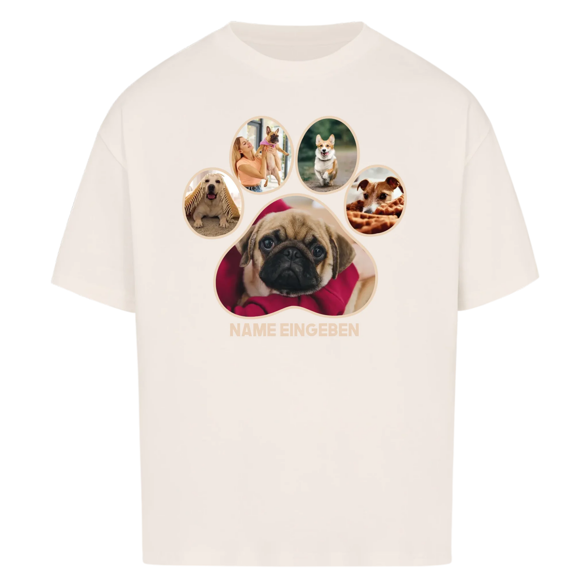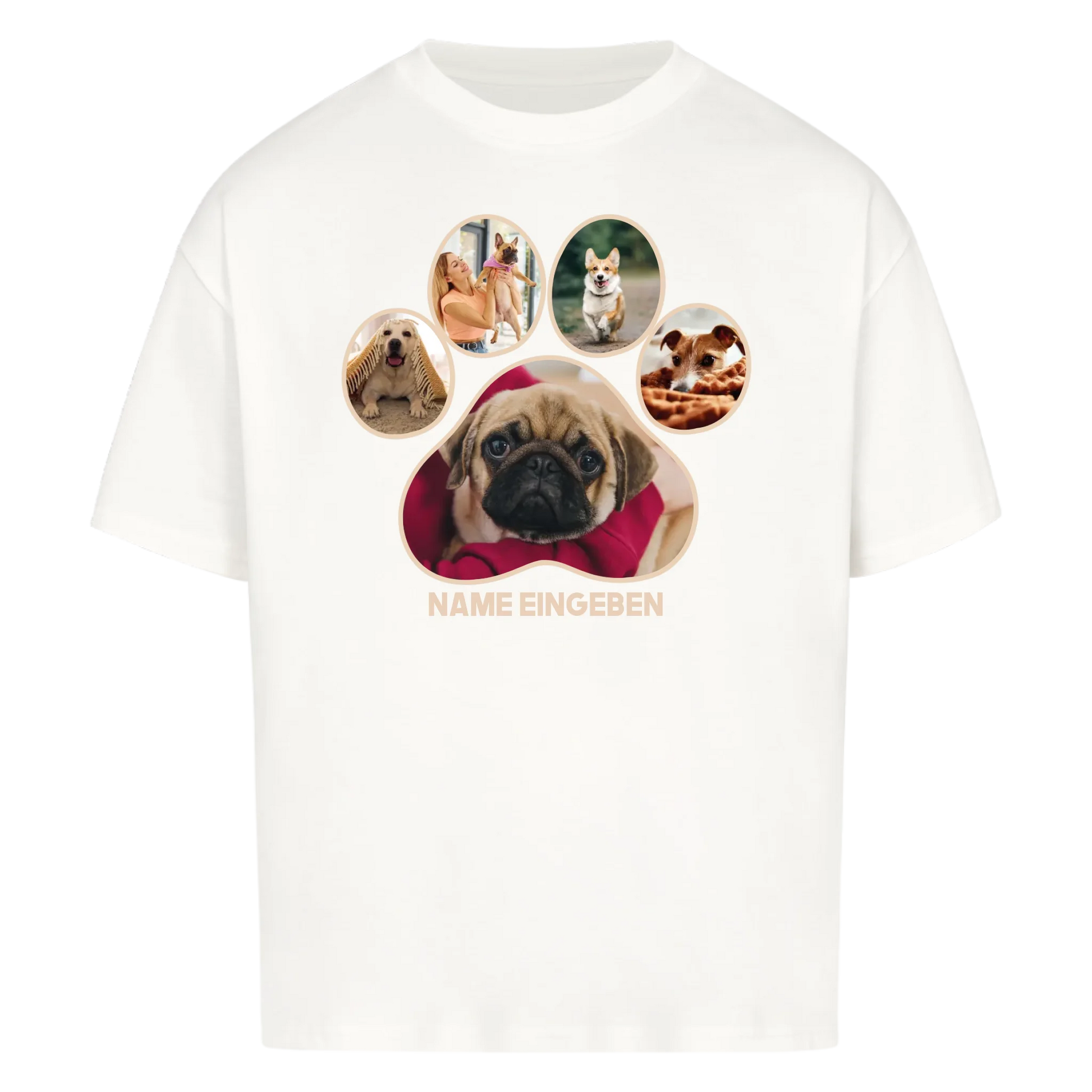 Gestalte dein Lieblingsoberteil mit bis zu 5 Fotos deines Vierbeiners und seinem Namen – liebevoll integriert in einer großen Pfotenform.