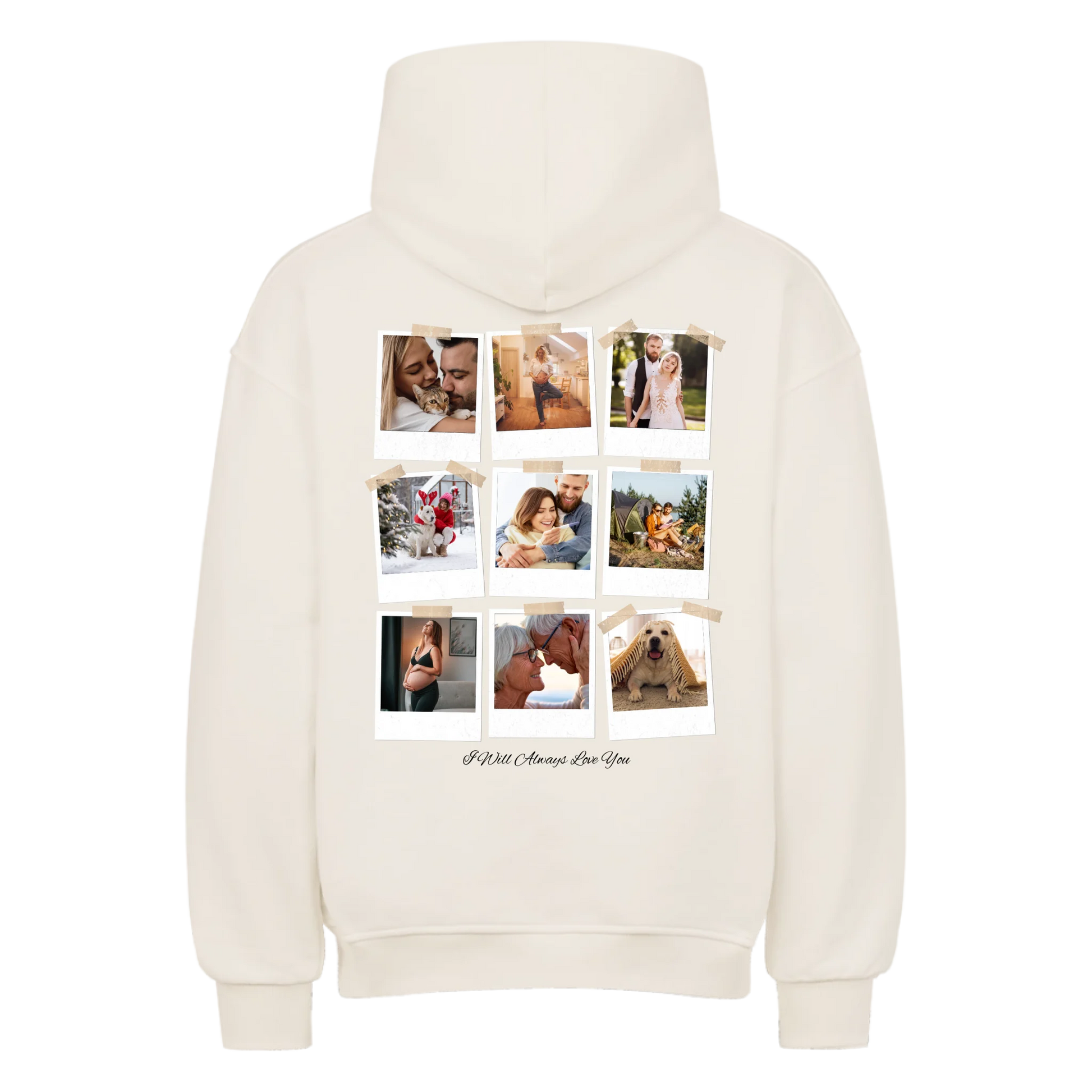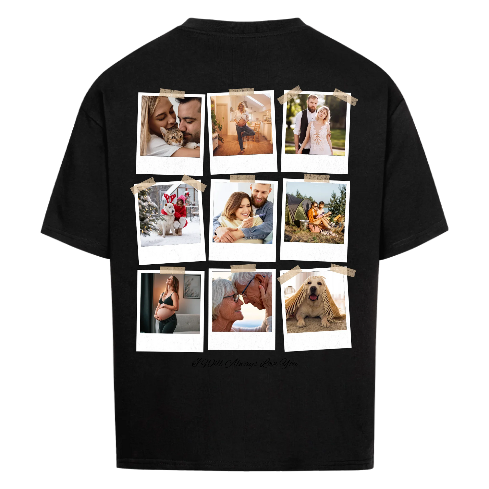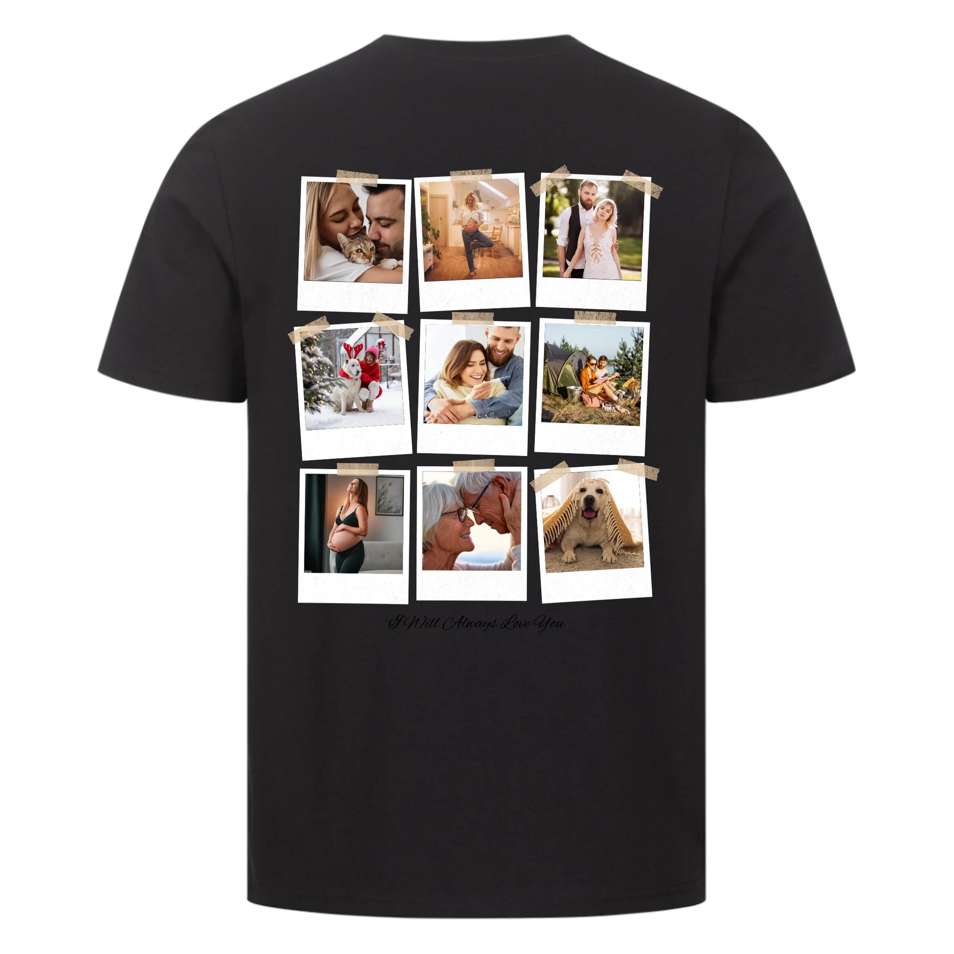 Lade 9 Fotos hoch – sie werden als kleine Polaroids angeordnet und machen dein Shirt zur persönlichen Galerie.